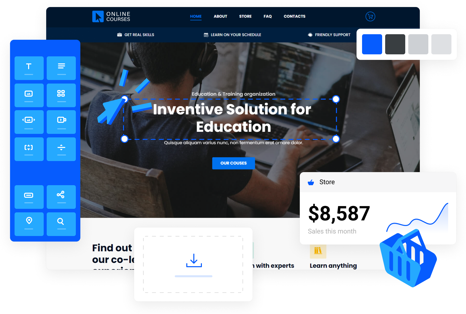You can use ready-made layout elements like text, buttons, photos, or icons to build any custom professional website layout.